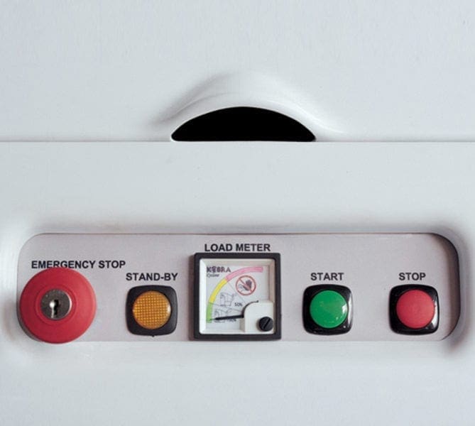 Control Panel: only just press the start button, throw the material into the large entry opening and leave, Kobra Cyclone will automatically shred everything and goes into standby mode when shredding is completed; a Load Meter positioned in the center of the control panel measures the actual load on the turbine and on the rotating blades and shows the operator the availability of the shredding capacity at any time during intensive and continuous shredding project, for full shredding output and power of the Kobra Cyclone