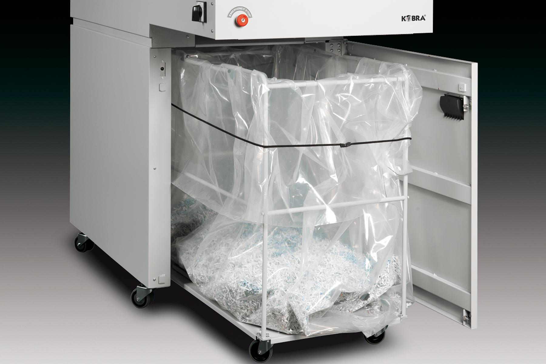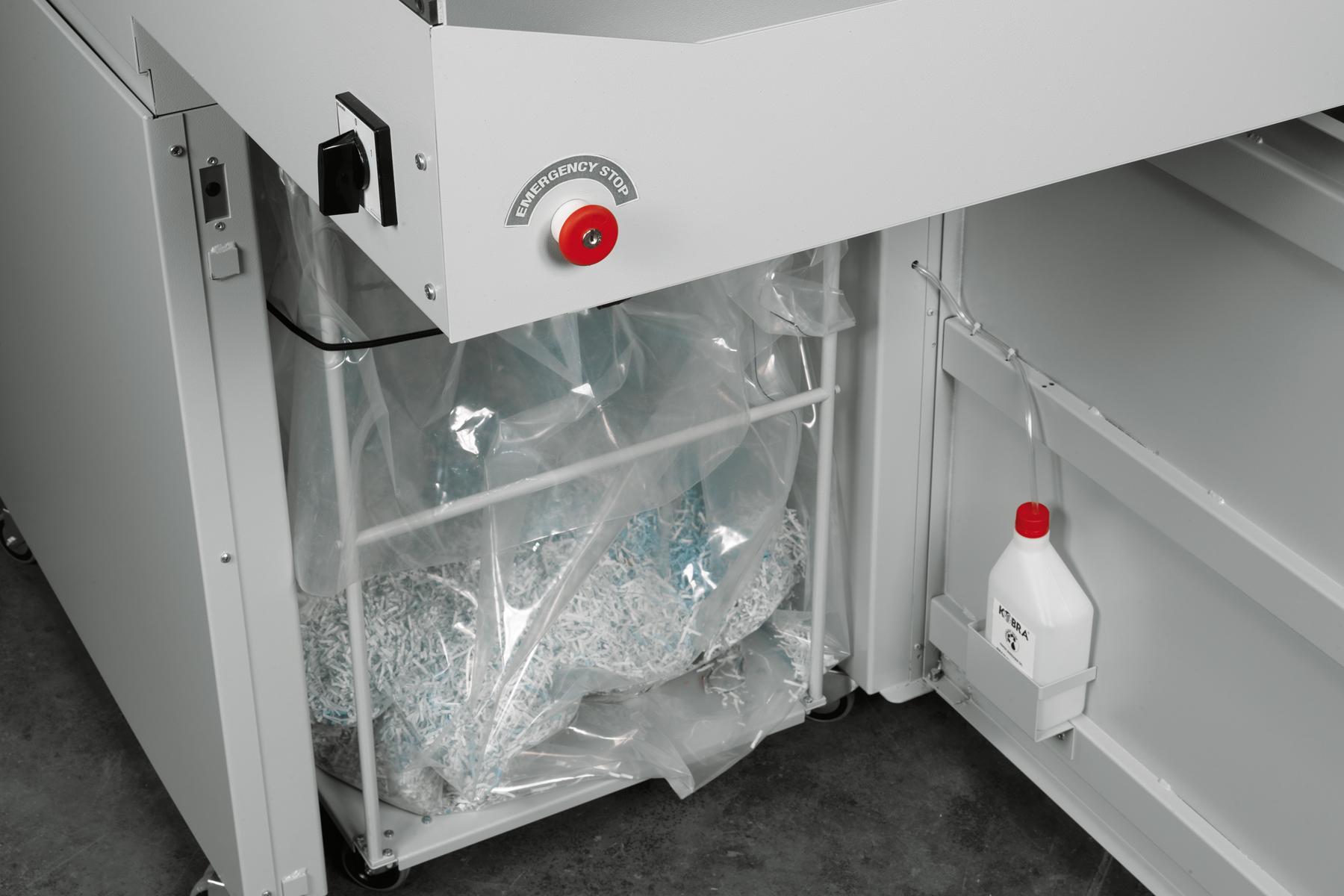 The Kobra 430 TS C4 Cross Cut is a heavy-duty industrial shredder designed for high-volume shredding operations. Equipped with a conveyor belt system, it efficiently processes large quantities of materials, including paper, credit cards, CDs/DVDs, floppy disks, Blu-ray discs, and USB drives. With a shredding capacity of up to 130 sheets per pass and a throughput of up to 660 lbs/hour, it ensures rapid and secure disposal of sensitive documents. The shredder operates continuously without the need for cool-down periods, thanks to its robust 5.4 HP motor and thermal protection features. An integrated automatic oiler maintains optimal performance by continuously lubricating the cutting blades. The Kobra 430 TS C4 meets Security Level P-3 standards, making it suitable for organizations that require reliable and efficient document destruction.