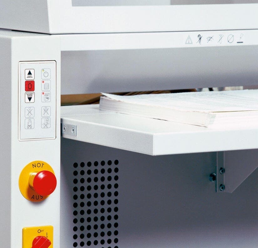 The Destroyit 4605 Cross Cut Paper Crusher main switch and emergency stop button are both conveniently located on the front side of this shredder. Photocell sensors located within the feed opening detect paper and automatically starts/stops the job. Functions automatic reverse, overfeeding occurs and power shutoff occurs.