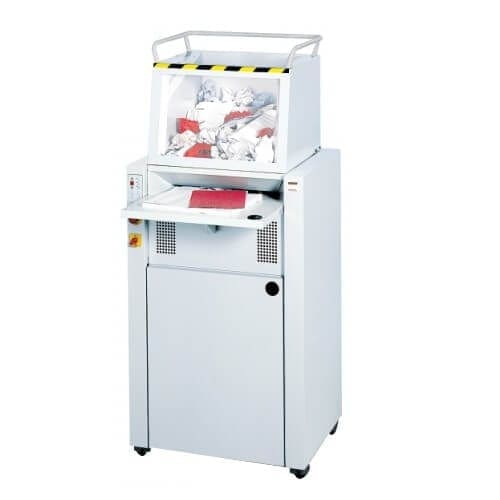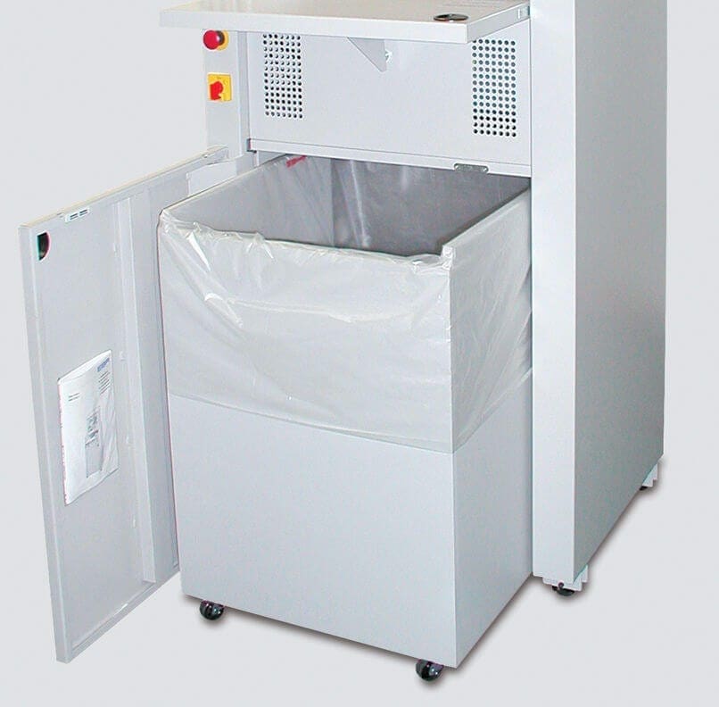 The Destroyit 4605 cross cut paper Crusher electronically controlled hopper tilts back to quickly fix paper jams. Power cuts off: If the cabinet door is opened and when the feed hopper or bin capacity bag is full.